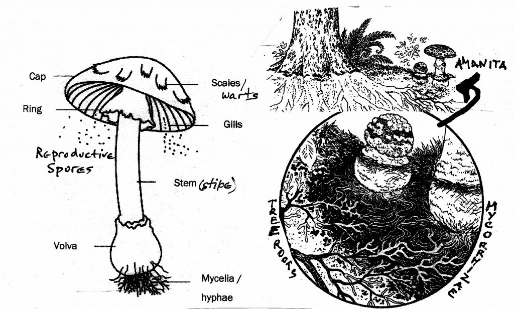 In general, most species in the Amanita genus are easily recognizable through the following features (see illustration 1): a cap with “warts” which are the remnants of the universal veil that encased the embryonic fruiting body; at the base a distinct volva out of which the fruiting body grew, a ring around the upper part of the stem/stipe, again part of the universal veil; white spores.