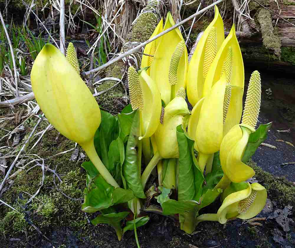 Every spring I visit the local “cabbage patch,” where strange flower spikes, protected by a bright yellow hood, arise miraculously from the inky black mud. Each flowering clump has fan-like waxy green leaves that grow to an enormous size. This exotic-looking, impressive plant makes a dramatic entrance in the spring that is not to be missed!