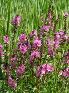 In late July a concerned individual contacted the Comox Valley Naturalists Society to report that purple loosestrife was running rampant in the Courtenay estuary! As the Wetland Restoration crew working on behalf of the CVNS had just finished working in the estuary I was surprised by the report. They had found and removed only a small number of the invasive purple loosestrife plants. Nevertheless I went down to check out this report. What I found was not purple loosestrife but masses of our beautiful native Henderson’s checkermallow (Sidalcea hendersonii) which is sometimes called the marsh hollyhock. From a distance it might well be mistaken for the nefarious purple loosestrife (Lythrum salicaria).
