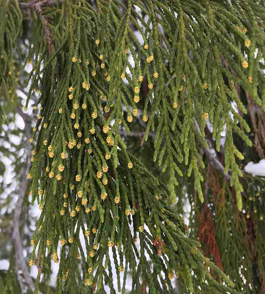 - Tiny male pollen cones dot the tips of yellow cedar branches.