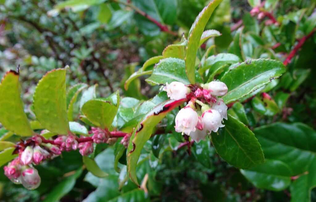 Evergreen huckleberry (Vaccinium ovatum). There is lot of this hardy huckleberry on the west coast. I found a few in bloom near Amphitrite Point.