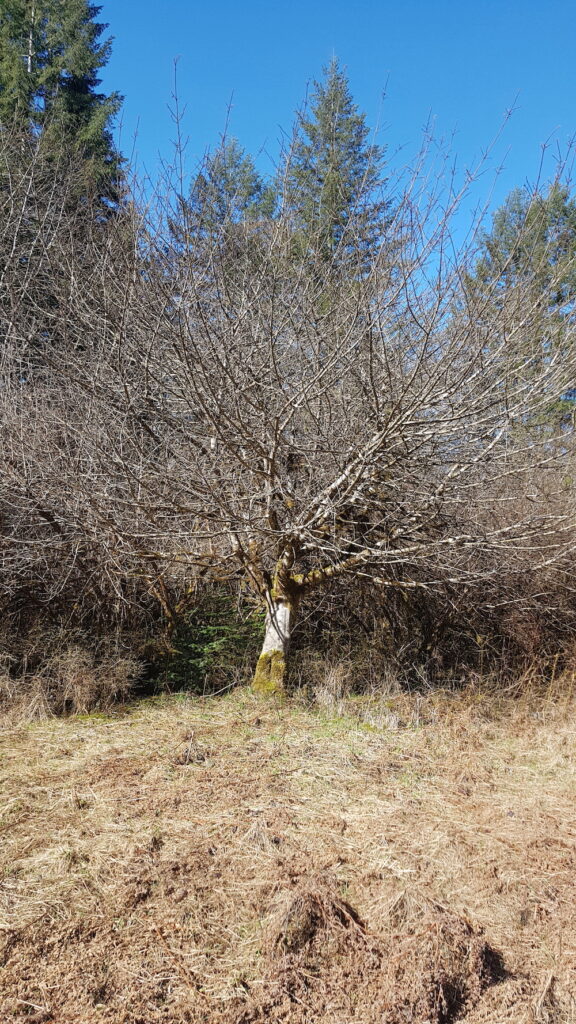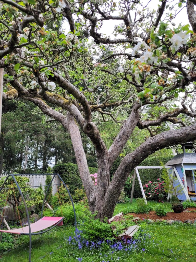 The owners of the property, Eve and Pete, have resided here for 20 years and believe that the previous 3 owners each stayed on the property for nearly that long as well. This tree has been carefully tended for many years above and below ground. Note the impeccable pruning it has benefitted from. Two of the main limbs that have some decay have been propped with wood to ensure the limb remains intact. Many buckets of apples are enjoyed and shared throughout the neighbourhood. Eve says “It is so beautiful viewed from every angle; you could just live under this tree.” The bare branches create fractals Eve never tires of observing.