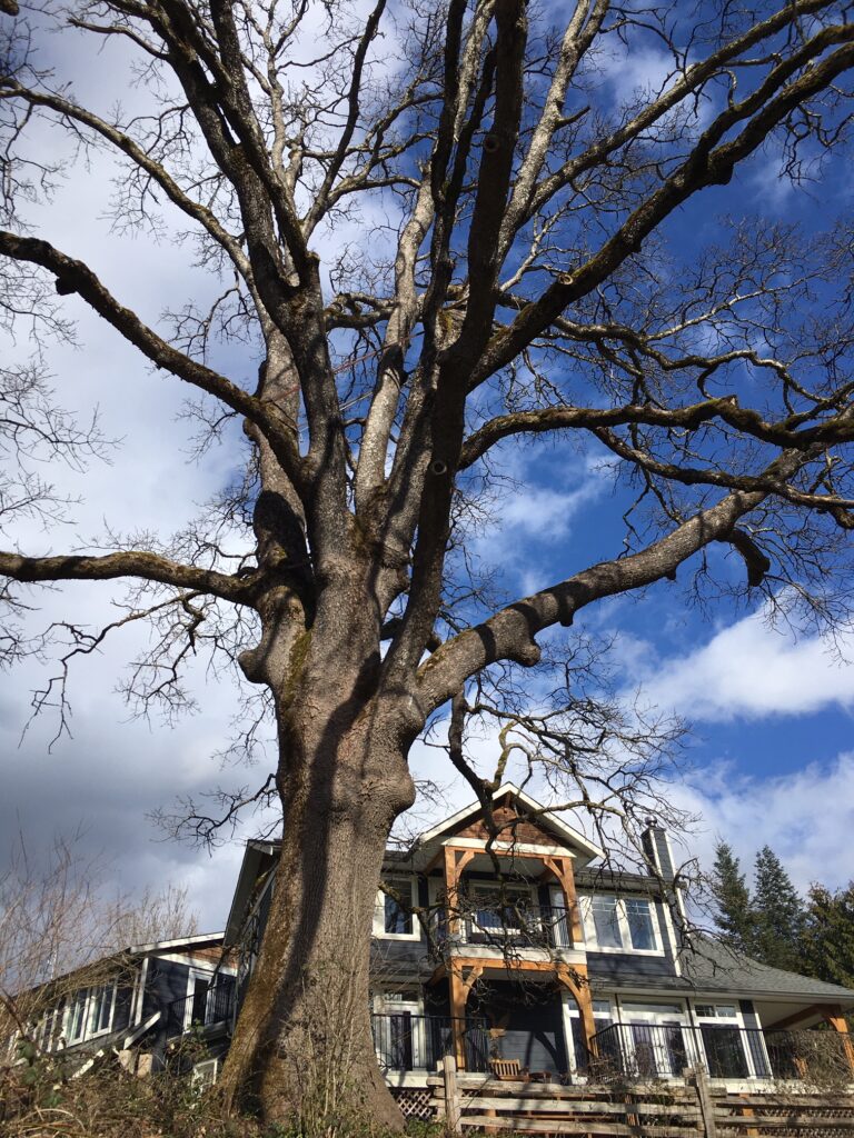 ‘’This amazing tree is visible walking or driving up Glacier Road (off Headquarters Road) on your right. It stands in front of the corner property at 3015 Glacier Road – often to be seen with a neighbouring nesting eagle eating a rabbit or seagull, scattering feathers and fur below, or a little black squirrel running up the rope. This is apparently arguably the largest northern-most Garry oak on Vancouver Island! It is significant to us because we bought this property because of this tree and designed the house around it – the house foundations start only beyond the root system, and the windows were designed to capture views of the foliage to create the feeling of being in its branches.