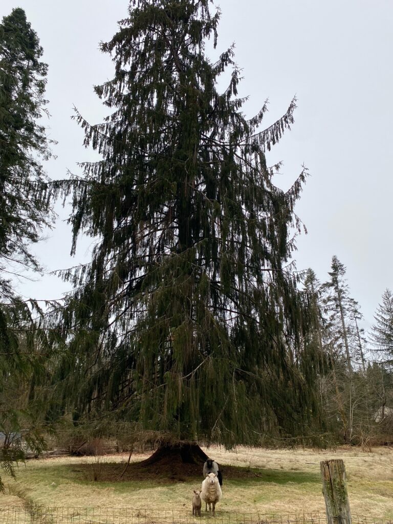 “The tree is unique, and while there are a few other similar trees in the area, this is the grandfather. Not sure if it was affected by copper leaching from the copper mine which fed into the river? The top has broken off in wind storms a few times in our 30 years here. Some of the “weeping” branches reach up to 6’ long. Our sheep trim the lower branches which would otherwise reach the ground. It protects a large patch of stinging nettle at the base in the spring. Numerous people have stopped to inquire and admire the tree.”