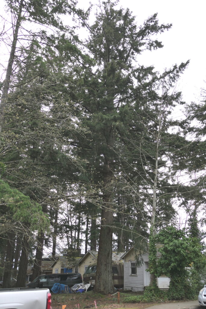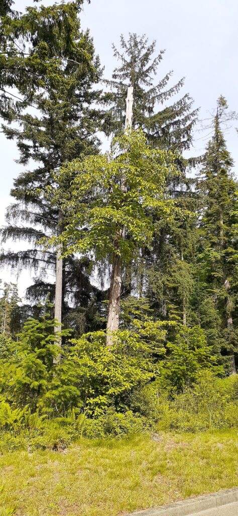 “This Douglas fir has guarded the community entrance for many years. It was originally part of a large group of firs when the area had a dirt one lane road and scattered summer cottages. Located nearby are groups of coastal Douglas firs. This tree has lost its top numerous times due to many storms. The lateral branches have taken over the top and this is what makes it look so “wolfy”. Something caused the sweep on the shorter stem and instead of dying it righted itself. It is features such as this on old veteran trees that make them very valuable as wildlife trees.