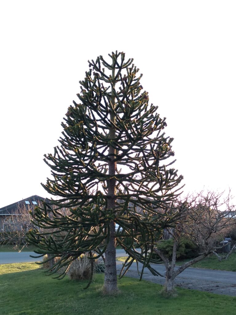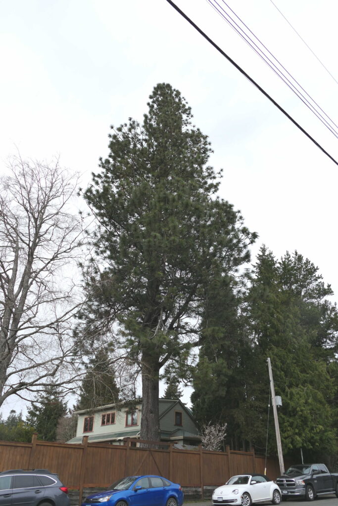 When you are viewing this tree, note that it has 5 soft needles in each bundle of needles. In comparison the Ponderosa pine in Comox is a 3-needle pine.