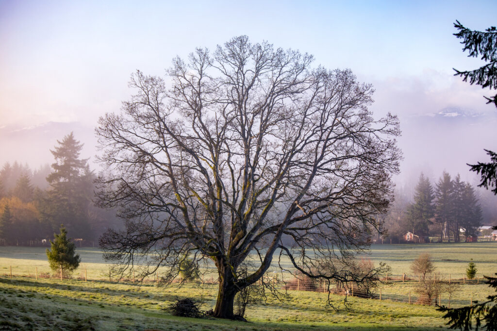 “A lone and aged oak tree in a meadow is an evocative sight; a witness to history that physically connects our present to the past in a very tangible way while also providing hope and optimism for existence far beyond our own. Garry oaks are unique to the southeast of Vancouver Island, the Gulf Islands, two spots in the Fraser Valley, Washington, Oregon and California, and their ecosystems are under continued threat, due primarily to development. While most of the Garry oak meadows, long nurtured by First Nations, are gone, or overgrown by competing vegetation, we are fortunate to have many impressive specimens still visible in fields, cemeteries, and roadsides throughout the Comox Valley that predate the first settlers.