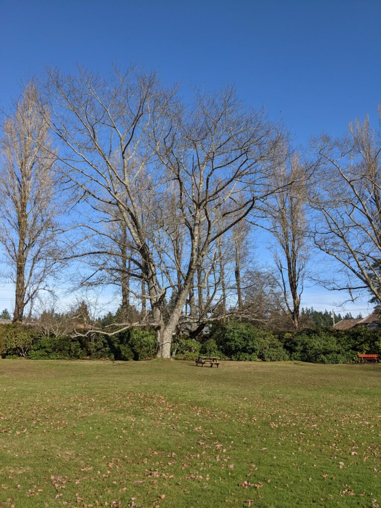 Location: Ruth Masters Greenway, 68 Powerhouse Rd., Courtenay. GPS of park at Powerhouse entrance: 49.68242, -125.03274, or enter off 1st St. access. Note: there is no cycling allowed in the Masters Greenway park so the 1st St. access (next to 2425 1st St., GPS: 49.682119, -125.025395) which is close to the tree location may be the best entrance for cyclists.