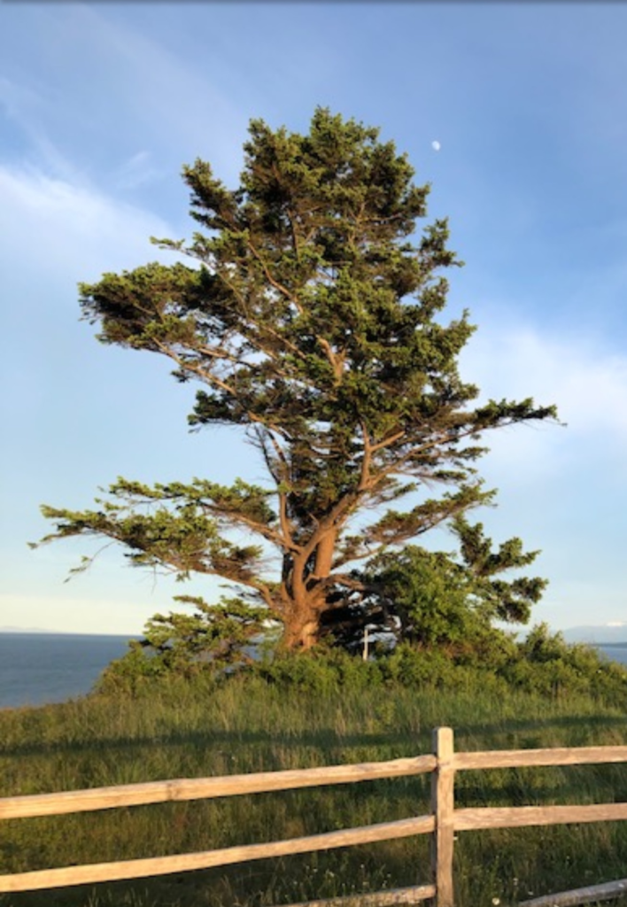 Adaptable, the Lazo oak are their own genotype and it’s awesome how perfectly suited they are to their location – once established they are naturally drought tolerant, preferring sunny locations not shaded by other trees. Their extensive root system making them very wind firm. They have become emblematic of this ecosystem with their shear-line or wind-blown canopy gently easing away from predominate heavy winds. Yes, this is one tree! The sandy ground is too harsh to support the growth of the oak from an acorn – not enough moisture held in the sandy soil to do so. Instead, the root system of the ‘mother’ tree spreads horizontally from the taproot to support the nutrient requirement and eventual growth of a new family member. A symbol of patience, this Comox Garry oak’s “Mothering System” expanse is close to 300 years old according to Judy Morrison who refers to herself as steward of the property and these magnificent, historical trees.