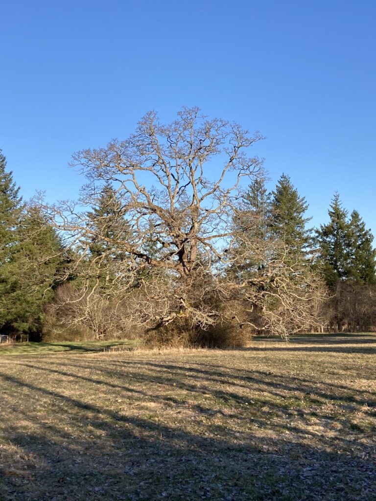 2. When we purchased our woodland, halfway up Forbidden Plateau road in 1997, we knew we were pushing the limits for a Garry oak, but all considerations aside we purchased a 3 ft one from the nursery at Swan Lake and planted it in an open, south-facing location. It is a thriving individual, snow and drought be damned. 25 years later it stands about 30 ft tall, cradled by its fir buddies and unperturbed by my son building his garage workshop right in front, blocking the southern sun. However by now it is over 10 ft above the garage roof. This perhaps is an extreme…for now.