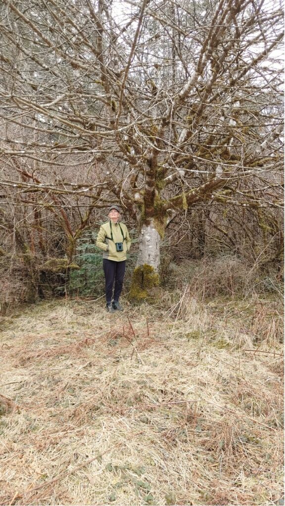 This Garry oak is approximately 120 cm DBH and 21 m tall. The owner has been told it could be 400 years old. Ruth says “this magnificent oak is guarded by the spirit of the eagle.”