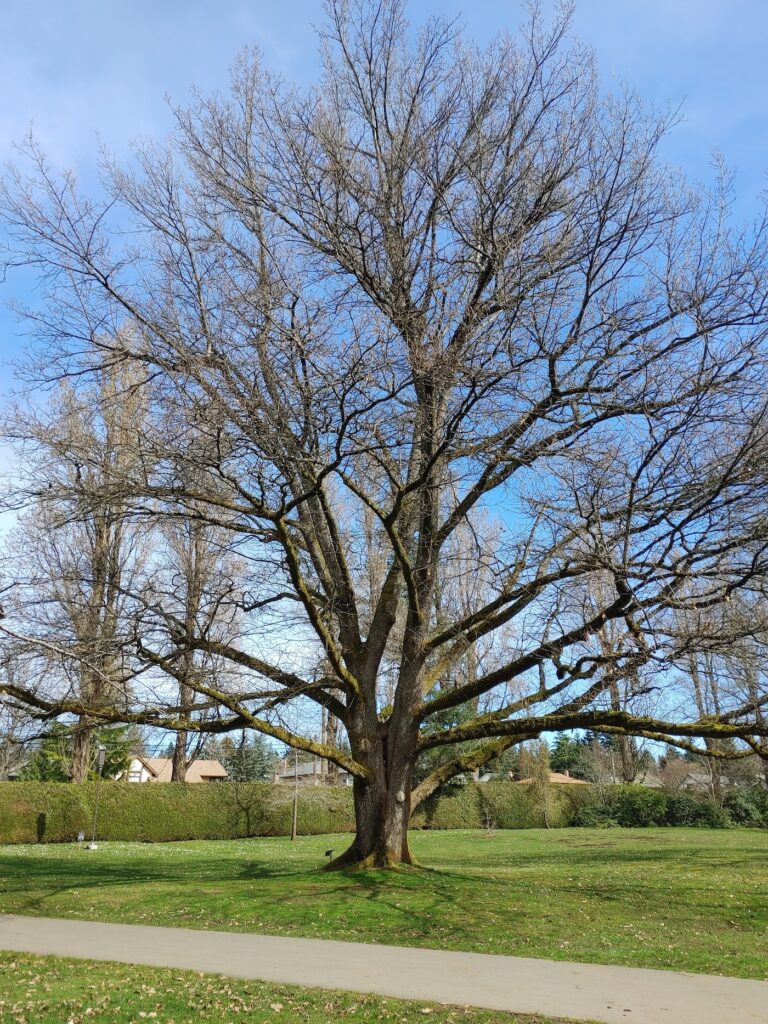 Location: In City of Courtenay Cousins Park: just beside the Courtenay Greenway trail – SW of the trail entrance at Tater Place just across bridge that crosses Piercy Creek and to the left of the path. It is approximately behind the Progressive Growth Garden Centre at 2459 Cousins Ave. GPS of tree: 49.668530, -124.997059.