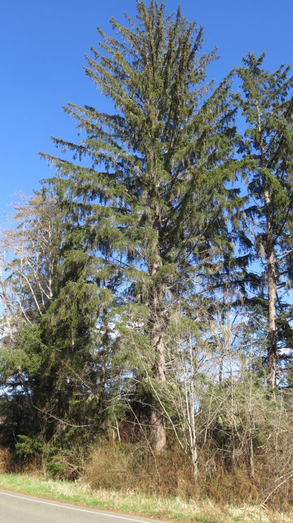 ‘’This tree is one of a number of mature Sitka spruce trees that make up a grove at ocean’s edge, in a Fanny Bay wetland area. This grove escaped the widespread logging of the 1930s so is now considered an unusual occurrence on the east coast of Vancouver Island. So much so that a tree genetic specialist recognized this grove for its unique Vancouver Island east coast genetics. Overlooking the estuary of Bob Springs Creek on the edge of Little Bay, this tree is a magnet for Red-tailed hawks, a resting place for eagles and of course a perch for the territorial Kingfisher! It is appreciated for its wide distinctive branches by all who pass by it transiting to and from Ships Point. However, when viewed on an overcast and foggy winter’s day this tree evokes a sense of eeriness.”