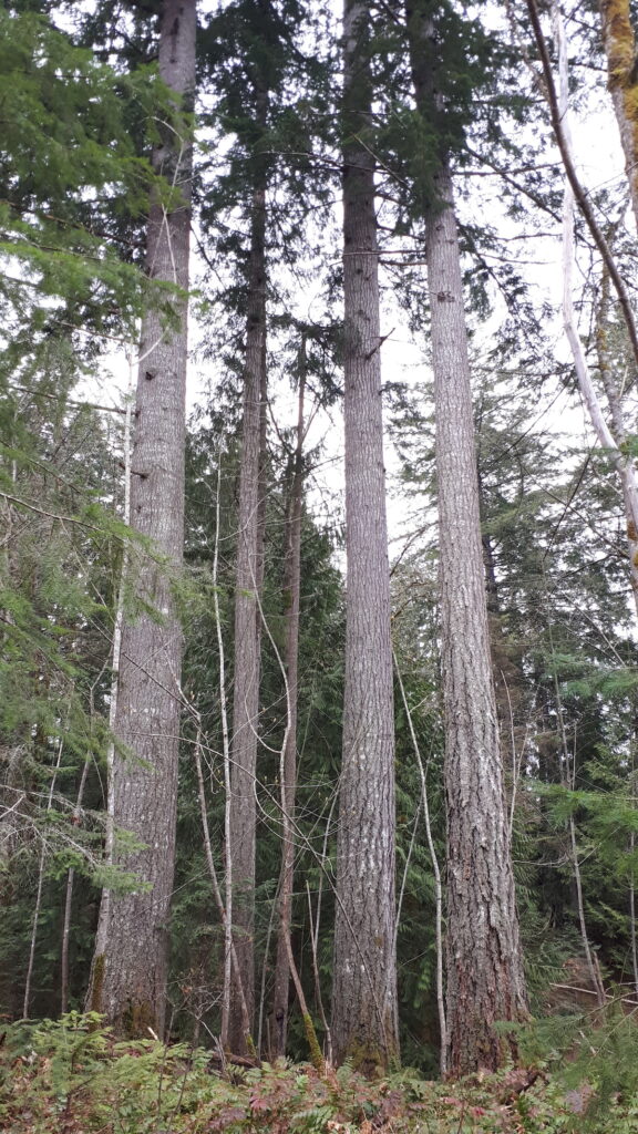 The Waterloo Creek area, in Fanny Bay, is host to a stand of trees that covers 24 hectares of Crown Land currently managed by the K’omox First Nation. In the 30s and 40s it was selectively logged for Douglas fir and redcedar leaving the unfavoured grand firs. In the early 40s the owner defaulted on the taxes for the land, and post-WWII, the land reverted to the Crown. Today, it is a marvellous mixed forest of very old and large conifers and deciduous trees, accented by the very large grand firs in the richer ecosystems. Of these, “Grand Mamma” stands out at a height of 68 m (223 ft or a 22-storey building) and a diameter of 120 cm (4 ft). Interestingly, the largest grand fir of record measuring 75 m is in the Chilliwack Valley. Could it be that the second largest is right here in Fanny Bay? There is a large stand, the “Grand Grove” which has eight large grand fir trees in an unusual linear pattern – can you spot them? The largest in the stand is 63 m high but only (!) 110 cm in diameter.