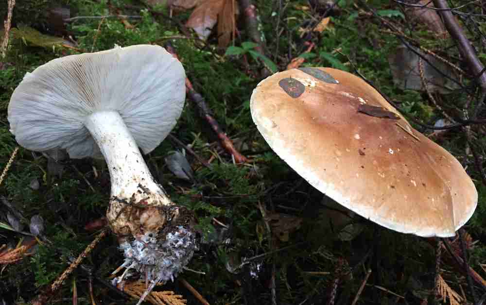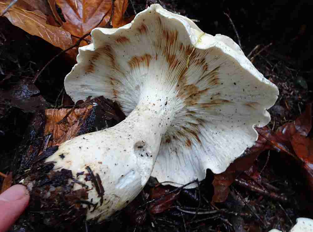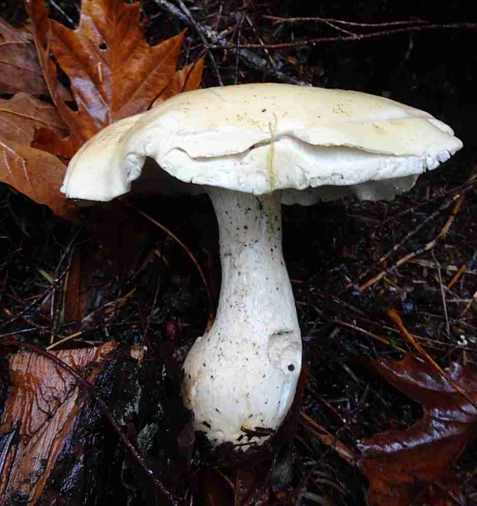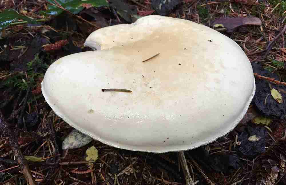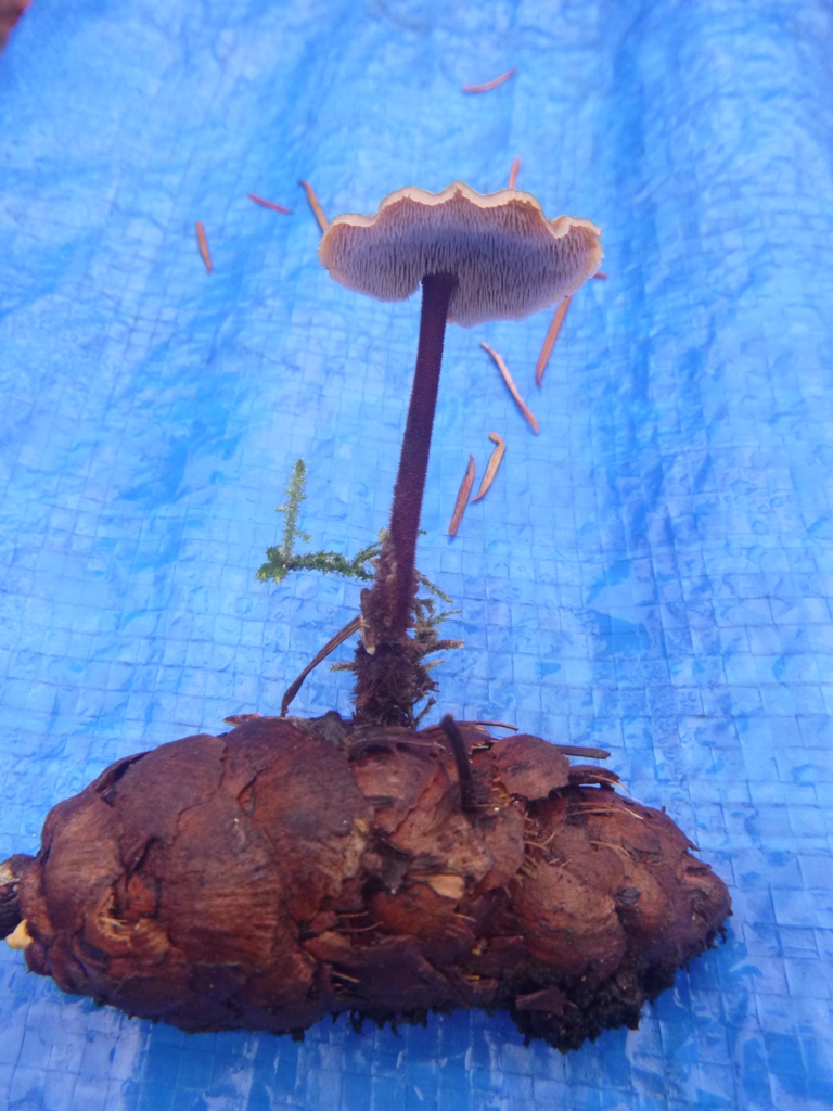 Next on the list is in the Sarcodon genus, the dark brown cap with scales of Sarcodon imbricatus, looking not unlike an aging Hydnellum aurantiacum. The photos #1 & 2, showing cap and underside, were taken by Jocie in the Merville Woods at Williams Beach Road. It can also be found up in the Park (e.g. Divers Lake area). There is another similar species found locally – S. scabrosus distinguished by darker underside and dark bluish coloration at the base of the stipe. A third species – Sarcodon fuscoindicus – is a stunning purple/dark blue, which could have been included in the “Blues and Greens” note. I found it in 2016 in the forest at Nymph Falls, but at the moment my photo is MIA, so here is a link to an image by Michael Beug in E-Flora.