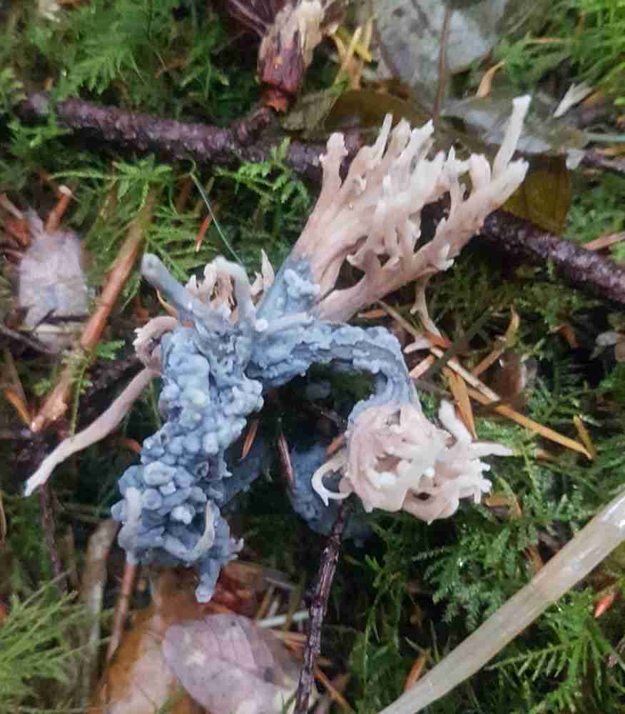 Another toothed fungus that has sometimes been confused with the hydnella is the Phellodon genus which is common in the valley and up to the subalpine. Photo #3 from the Comox Lake Bluffs Ecological Reserve is Phellodon tomentosus, which has a beige to brown centre and off-white margin on the cap, and beige on the underside. Phellodon atratus is also found here – with a dark centre and lighter margins on the cap and greyish/purplish teeth on the underside.