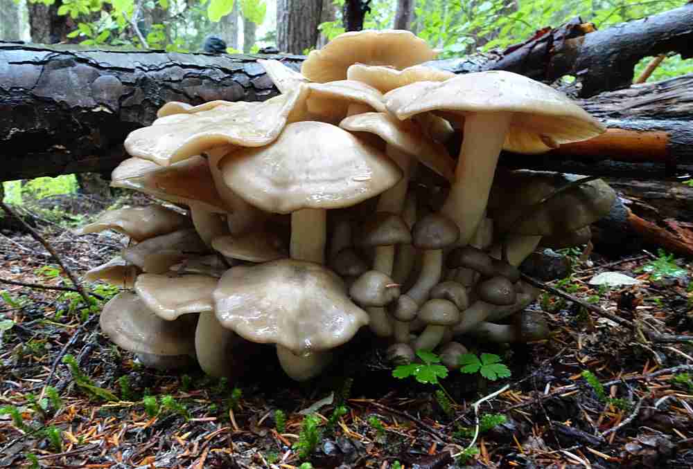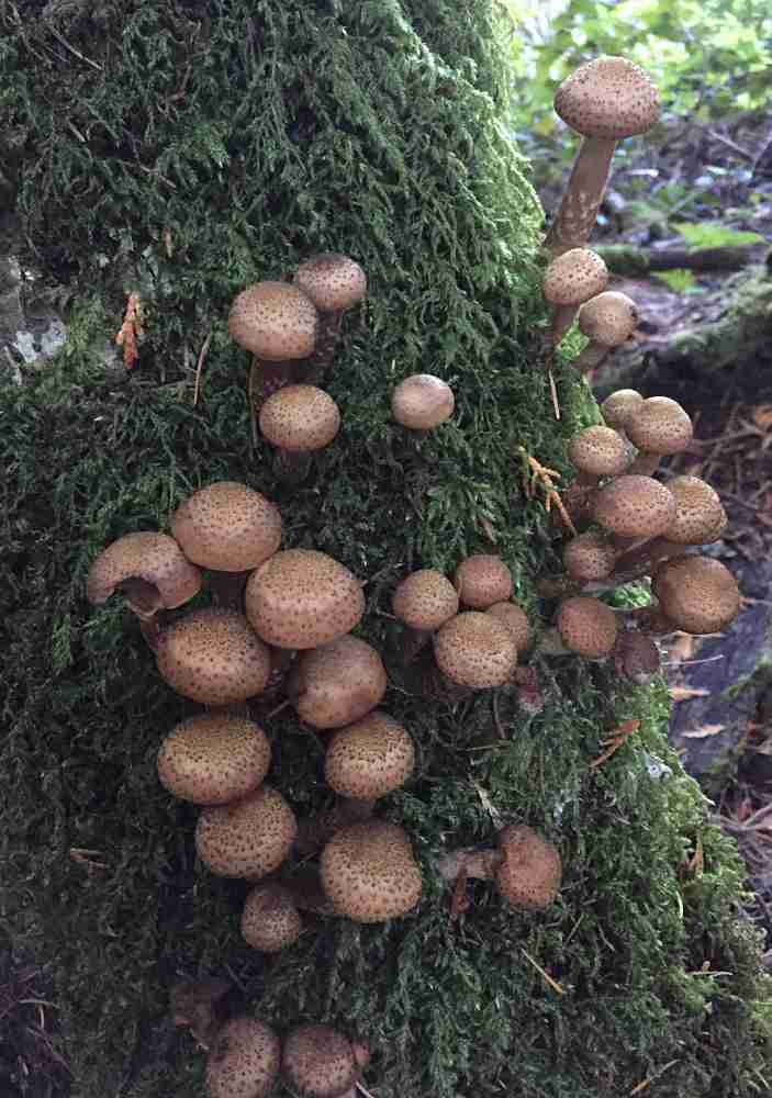 This shroom grows in bright yellow clusters on rotting logs, snags and stumps. Older specimens have a distinctive ring.