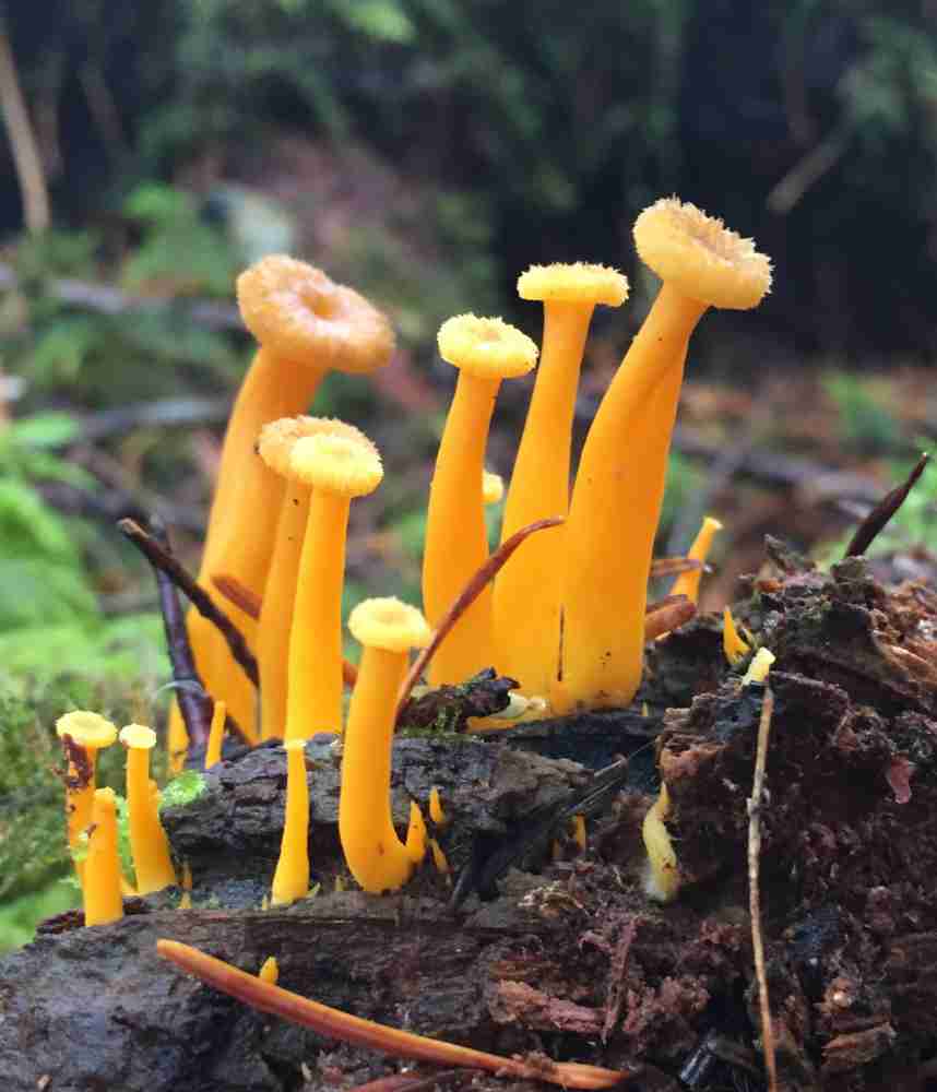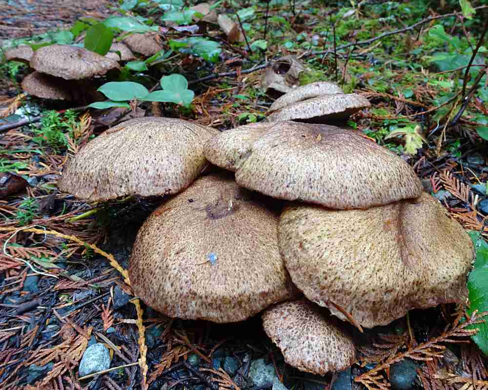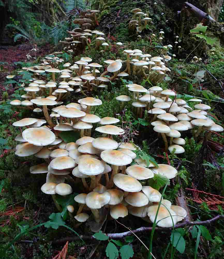 There are some spectacular displays of “big laughing gym”, also known as “western jumbo gym” (Gymnopilus ventricosus) at Seal Bay Park. You can find it about 3/4 of the way down the main beach trail (on the right) that descends down the ravine. Just before the beach, fork to the right and just past the little bridge (just before the beach) there are several more clumps on the left.