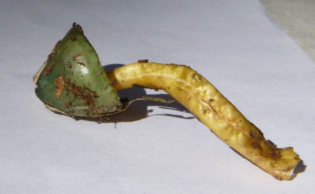A couple of examples have appeared in the past month, one up in Paradise Meadows: Clitocybe odora var. pacifica – blue-green anise clitocybe (photo #1) and the other down in the valley on Tsolum River Road: Stropharia aeruginosa – no common name (#2–#4). The former, as its name suggests, is recognisable by its anise-like odour as well as by the blue-green tinge. This Stropharia ends up looking very much like the common Stropharia ambigua with a yellowish cap, as well as the distinctive cottony remnants of its veil around the rim of the cap and on the stipe, and its purple/charcoal spore. It is only in the semi-opened shroom that the blue-green is visible.