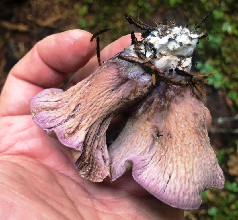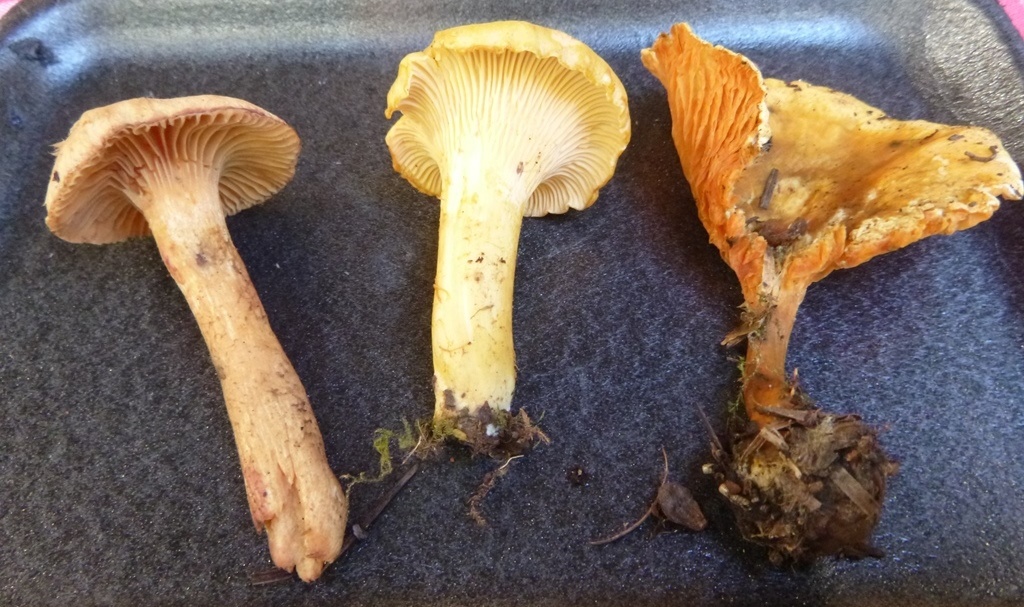 - Amanita smithiana, which by contrast has a long stipe, emerging from a bulbous base that tapers towards the “root” end (photos 8 & 9). Hence the latter might be mistaken for Tricholoma magnivelare (pine mushroom, photo 10) which of course has no warts, and is recognizable by its sweet cinnamon smell. As always, PICKER BEWARE.