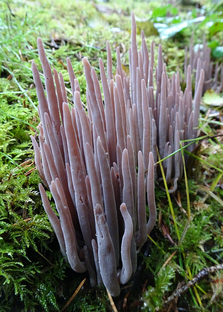 1. and 3. Purple spindles (Alloclavaria purpurea) from  the edge of a mossy ditch in the upper campsites of Miracle Beach Park.