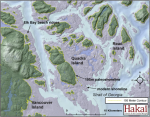 flexure driven by the accumulation of strain near the subduction zone) and the slow rebound of the Earth’s crust in our area after it was buried under 1-2km of ice at the peak of the ice age. Locally, a recent paper by Fedje et al. provided evidence for sea levels being almost 200m higher. The map below is from the linked paper and shows the location of paleoshorelines in the Quadra Island area circa 14,000 years ago. We saw a much more recently exhumed shoreline just above the present beach.