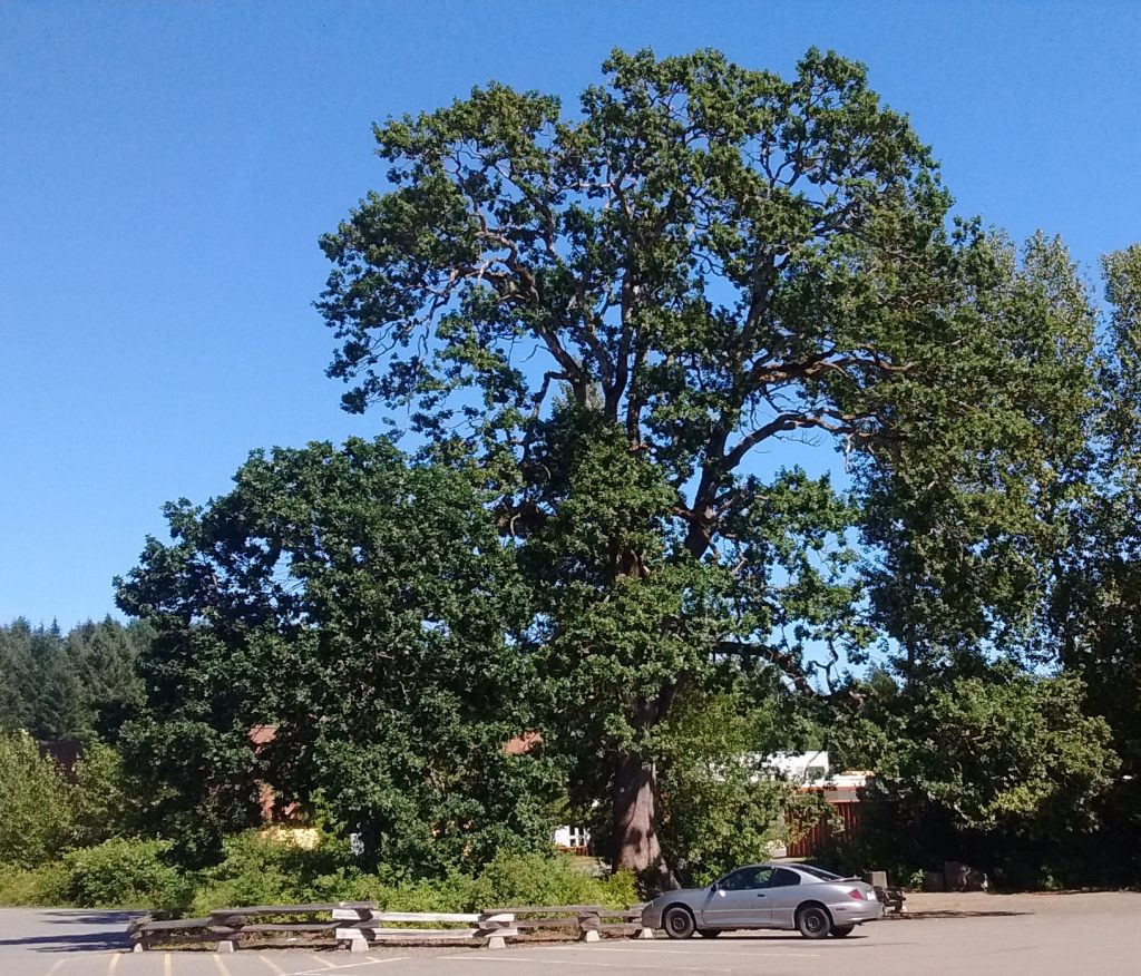 In the second year of Comox Valley Nature’s Tree of the Year contest, the award went to a very large Garry oak (Quercus garryana) in the parking lot of the Comox Valley Sport Centre on Vanier Road. This majestic specimen is one of the few left after the Centre was constructed, and is surrounded by a small fence. This area possibly has the largest number of Garry oaks on public land in the Valley.