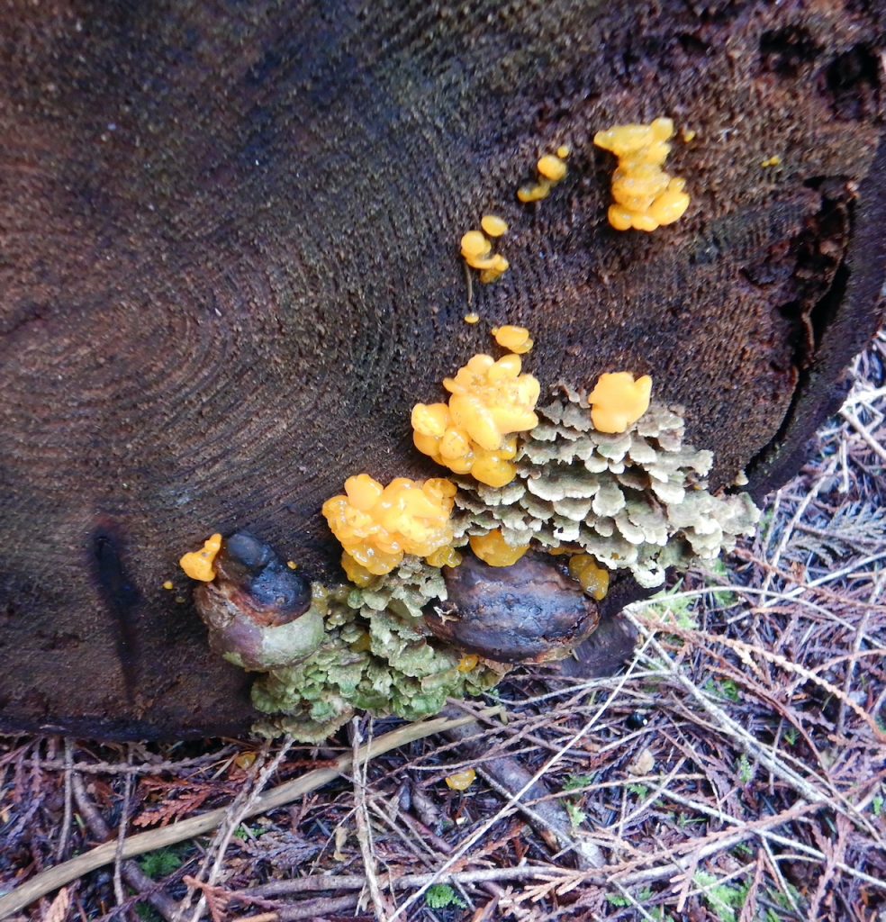 Of fungi there were quite a few of those you [the Botany Group] have already found in other locations (the little pink Scytinotus longinquus on dead alder seems to be everywhere!). Photo 2 shows the cut end of a dead conifer trunk with a little garden of fresh Dacrymyces chrysospermus (witch’s butter), plus old Trichaptum abietinum, its usual pink cap well covered in green algae and a couple of Fomitopsis mounceae.