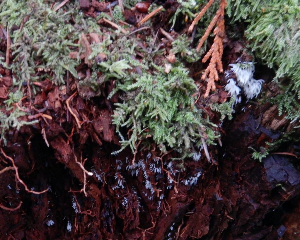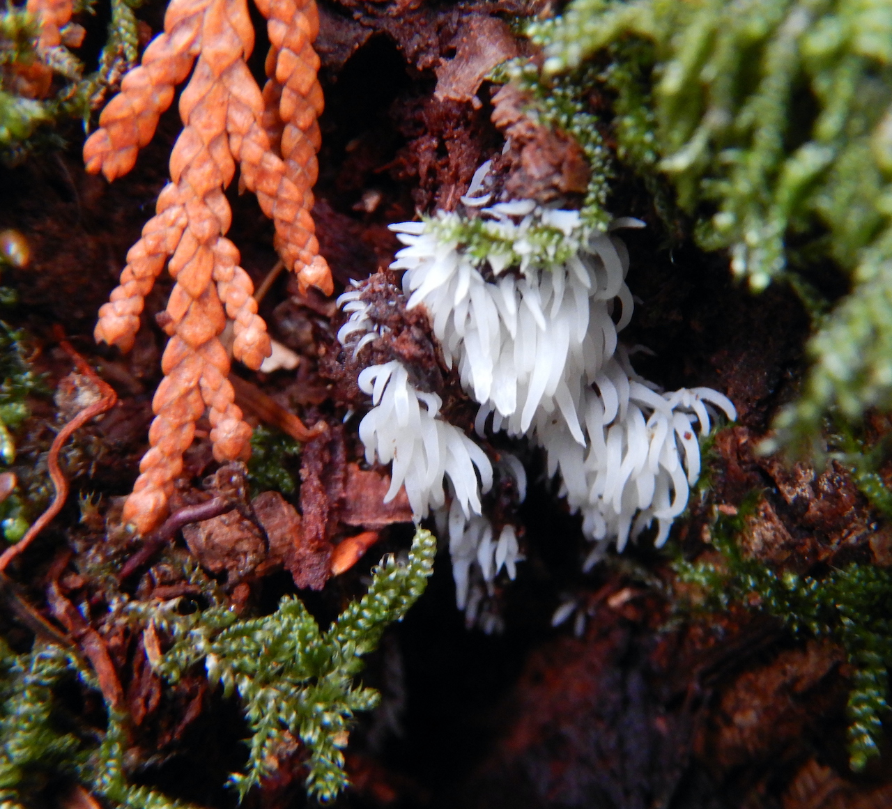 More unusual was the splendid example of Mucronella pendula (photos 3 & 4), sometimes called white icicle. The dead red cedar leaflet gives a sense of how small it is.