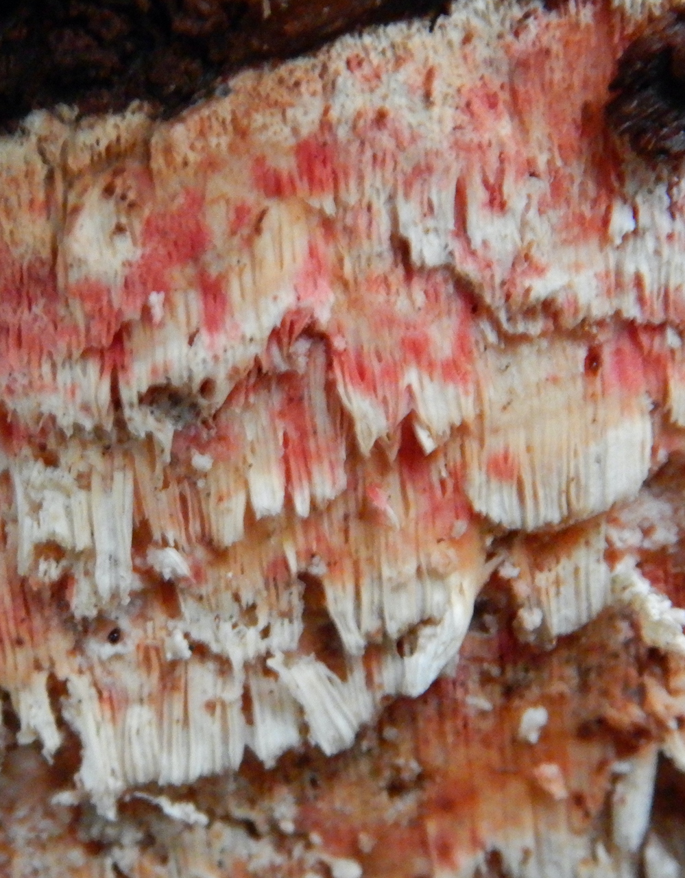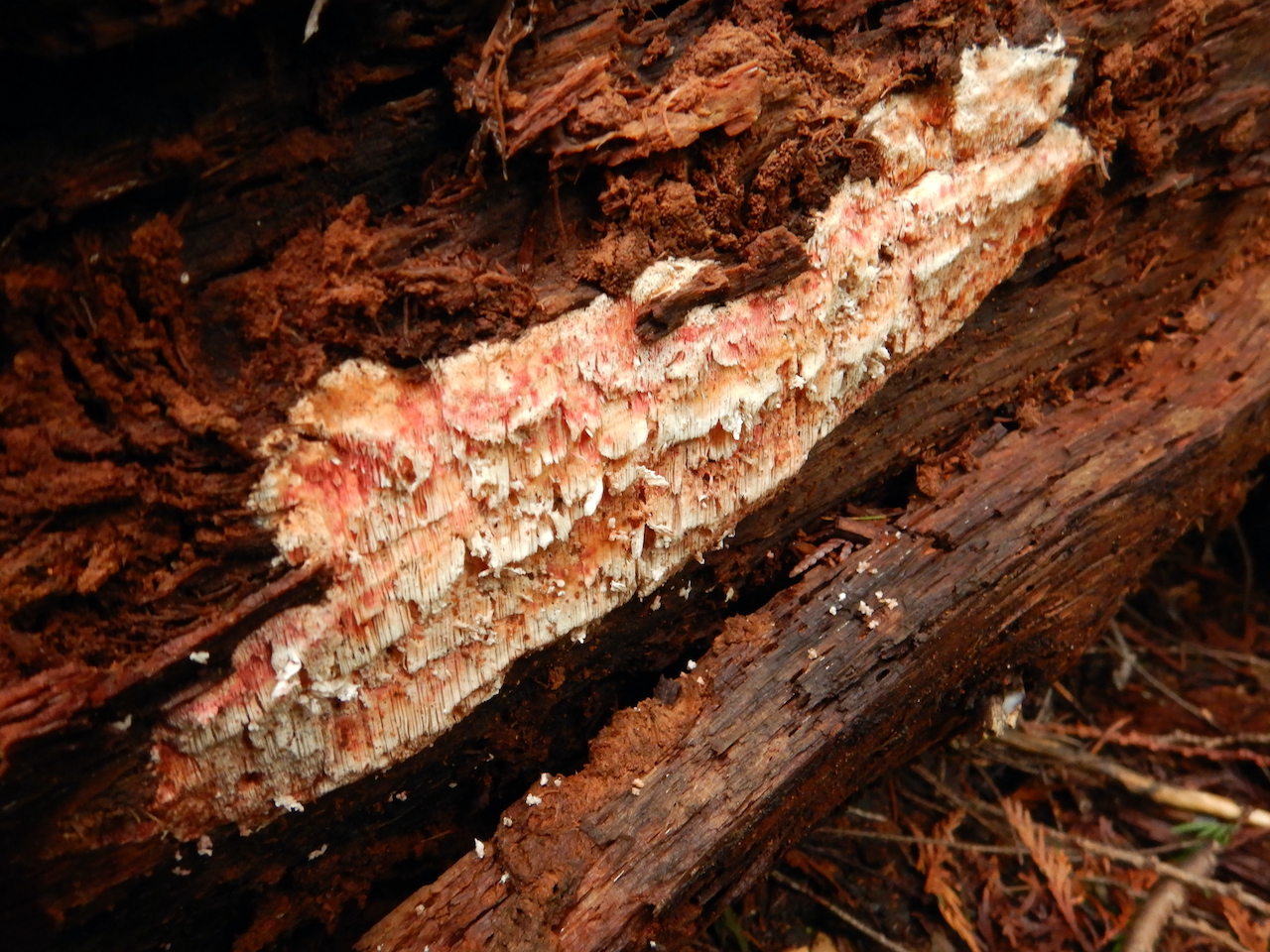 Along the side of another dead conifer we found a large specimen of not quite fully developed Pycnoporellus alboluteus, which is a spongy polypore and can look like a clump of stalactites when older (photos 5 and not well-focussed 6). This specimen had a fair amount of red – it is often more of a dingy orange and beige. It tends to be found underneath logs, in spring as the snow recedes.